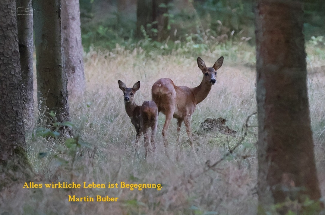 Seit Monaten begleite ich eine Ricke zunächst allein, inzwischen mit Ihrem Kitz. Immer wieder begegnen wir uns im Wald, halten inne und schauen uns gegenseitig an. Inzwischen ist viel Vertrauen gewachsen, der angeborene Fluchtinstinkt der Tiere ist weitgehend gewichen. Für mich ist jede Begegnung mit diesen Tieren ein besonderer, unendlich wertvoller Moment. Ich spüre eine Verbindung zu ihnen und zur Natur. Ich bin ganz bei mir, erfüllt, zufrieden und glücklich. Vielleicht wird aus all diesen Begegnungen und den dabei entstandenen Bildern mal ein Kinderbuch oder ähnliches, doch das ist eine andere Geschichte.